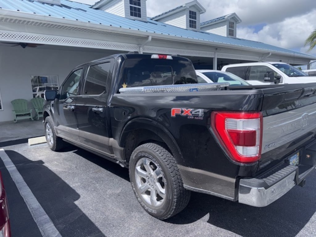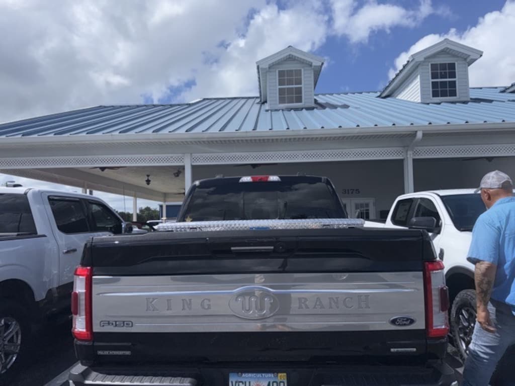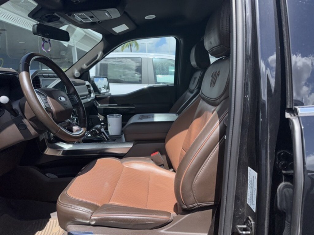 Features include: Bed Utility Package (BoxLink, LED Box Lighting, Power Tailgate, and Tailgate Step w/Tailgate Work Surface), Equipment Group 601A High (Power-Deployable Running Boards and Radio: B&O Unleashed Sound System by Bang & Olufsen), FX4 Off-Road Package (4x4 FX4 Off-Road Bodyside Decal, Hill Descent Control, Monotube Rear Shocks, Off-Road Tuned Front Shock Absorbers, Rock Crawl Mode, and Tray Style Floor Liner), King Ranch Chrome Appearance Package (Bright Belt Moldings, Chrome Door Handles w/Body-Color Strap, Chrome Skull Caps on Exterior Mirrors, and Wheels: 20" Chrome-Like PVD), Trailer Tow Package (Class IV Trailer Hitch Receiver, Integrated Trailer Brake Controller, and Pro Trailer Backup Assist & Pro Trailer Hitch Assist), 20" Machined-Aluminum Wheels, 360 Degree Camera, 4-Wheel Disc Brakes, 8 Speakers, ABS brakes, Adjustable pedals, Air Conditioning, Alloy wheels, AM/FM radio: SiriusXM with 360L, Auto High-beam Headlights, Auto Start-Stop Removal (DISC), Auto tilt-away steering wheel, Auto-dimming door mirrors, Auto-dimming Rear-View mirror, Automatic temperature control, Brake assist, Compass, Delay-off headlights, Driver door bin, Driver vanity mirror, Dual front impact airbags, Dual front side impact airbags, Electronic Stability Control, Emergency communication system: SYNC 4 911 Assist, Extended Range 36 Gallon Fuel Tank, Exterior Parking Camera Rear, Front anti-roll bar, Front Bucket Seats, Front Center Armrest, Front dual zone A/C, Front fog lights, Front License Plate Bracket, Front reading lights, Front wheel independent suspension, Fully automatic headlights, Garage door transmitter, Genuine wood console insert, Genuine wood dashboard insert, Genuine wood door panel insert, Heated door mirrors, Heated front seats, Heated rear seats, Heated steering wheel, Illuminated entry, Inclination/Intrusion Sensor Removal, King Ranch Leather Bucket Seats, LED Sideview Mirror Spotlights, Low tire pressure warning, Memory seat, Multicontour Seats w/Active Motion Removal, Occupant sensing airbag, Outside temperature display, Overhead airbag, Overhead console, Panic alarm, Passenger door bin, Passenger vanity mirror, Pedal memory, Power door mirrors, Power driver seat, Power passenger seat, Power steering, Power windows, Radio data system, Radio: B&O Sound System by Bang & Olufsen, Rain sensing wipers, Rear reading lights, Rear seat center armrest, Rear step bumper, Rear window defroster, Remote keyless entry, Security system, Speed control, Speed-sensing steering, Split folding rear seat, Steering Wheel Heat Removal (DISC), Steering wheel memory, Steering wheel mounted audio controls, SYNC 4 w/Enhanced Voice Recognition, Tachometer, Telescoping steering wheel, Tilt steering wheel, Traction control, Trip computer, Turn signal indicator mirrors, Variably intermittent wipers, Ventilated front seats, and Voltmeter.