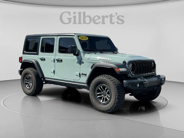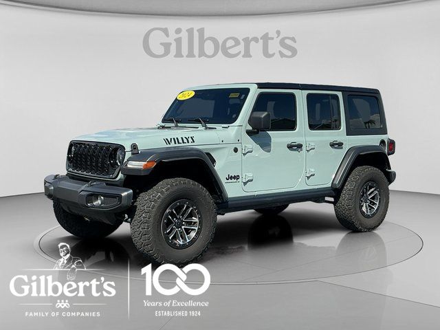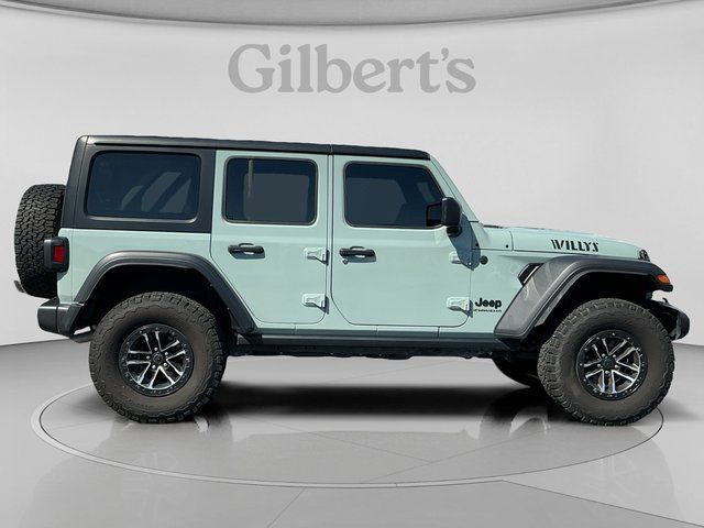 Features include: Quick Order Package 24W Willys (240 Amp Alternator, 4-Wheel Drive Swing Gate Decal, 7 & 4 Pin Wiring Harness, 97 MPH Vehicle Max Speed Calibration, Advanced Brake Assist, Automatic Headlamps, Auxiliary Switches, Black Grille, Class II Receiver Hitch, Conventional Differential Front Axle, Corning Gorilla Glass, Dana M210 Wide HD Tube Front Axle, Dana M220 Wide Rear Axle, Daytime Running Lamps LED Accents, Deep Tint Sunscreen Windows, E-Locker Rear Axle, Enhanced Adaptive Cruise Control, Front 1-Touch Down Power Windows, Front LED Fog Lamps, Full Speed Forward Collision Warning Plus, Injection Molded Black Rear Bumper, LED Premium Reflector Headlamps, Mold In Color Bumper w/Gloss Black, Molded in Color Rubicon Highline Flare, MOPAR All-Weather Floor Mats, Off-Road Plus Mode, Power Heated Mirrors, Premium Wrapped Steering Wheel, Remote Keyless Entry, Security Alarm, Speed Sensitive Power Locks, Sun Visors w/Illuminated Vanity Mirrors, Wheels: 17" x 7.5" Painted Black, Willy's Suspension, Willys, and Willys Hood Decal), Xtreme 35" Tire Package (35" Tire Suspension, Anti-Lock 4-Wheel Disc Perf Brakes, MOPAR Hinge-Gate Reinforcement, Wheel Flare Extensions, and Wheels: 17" x 8" Machined w/Black Pockets), 110 MPH Vehicle Max Speed Calibration, 4-Wheel Disc Brakes, 8 Speakers, ABS brakes, Air Conditioning, AM/FM radio, Apple CarPlay/Android Auto, Aux Battery, Black 3-Piece Hard Top, Brake assist, Cloth Low-Back Bucket Seats, Compass, Delay-off headlights, Driver door bin, Driver vanity mirror, Dual front impact airbags, Dual front side impact airbags, Electronic Stability Control, Freedom Panel Storage Bag, Front anti-roll bar, Front Bucket Seats, Front Center Armrest w/Storage, Front fog lights, Front reading lights, Integrated roll-over protection, Low tire pressure warning, No Soft Top, Non-Lock Fuel Cap w/o Discriminator, Normal Duty Suspension, Occupant sensing airbag, Outside temperature display, Overhead airbag, ParkView Rear Back-Up Camera, Passenger door bin, Passenger vanity mirror, Power steering, Radio data system, Radio: Uconnect 5 w/12.3" Display, Rear anti-roll bar, Rear reading lights, Rear Window Defroster, Rear Window Wiper/Washer, Speed control, Split folding rear seat, Steering wheel mounted audio controls, Stop-Start Dual Battery System, Tachometer, Telescoping steering wheel, Tilt steering wheel, Traction control, Trip computer, Variably intermittent wipers, and Wheels: 17" x 7.5" Black Steel Styled.