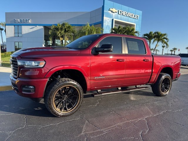 *Carfax Accident Free*, *Crewcab*, *4WD*. 2025 Ram 1500 Laramie Delmonico Red Pearlcoat Odometer is 9907 miles below market average!All advertised sales prices include all available rebates, incentives, discounts, and price reductions. Tax, tag, title, license, Dealer Service Fee of $899.00, Electronic Filing Fee of $188.50, and $695.00 Lease Acquisition Fee if applicable (unless itemized above) are extra. Not available with special finance or lease offers. Although every reasonable effort has been made to ensure the accuracy of the information contained on this site, absolute accuracy cannot be guaranteed. This site, and all information and materials appearing on it, are presented to the user as is without warranty of any kind, either express or implied. All vehicles are subject to prior sale. All prices, specifications and availability subject to change without notice. Some vehicles may have upfits or accessories that are not yet added to the price as they are in process of completion. Contact dealer for most current information. The actual mileage of Demonstration (DEMO) and Courtesy Transportation vehicles is more than normal new retail units and may be more than what is shown in the Vehicle Description due to these vehicles being in active service. Please call us to confirm current mileage. Laramie Level 1 Equipment Group (Rain Sensitive Windshield Wipers and Remote Tailgate Release), Quick Order Package 21H Laramie, Sport Appearance Package (#1 Seat Foam Cushion, 3 Rear Seat Head Restraints, 4 Way Front Headrests, Accent Color Premium Power Mirrors, Auto Power-Folding Mirrors, Auto-Dimming Exterior Driver Mirror, Black Interior Accents, Black Painted Exterior Mirrors Caps, Body Color Front Bumper, Body Color Rear Bumper w/Step Pads, Bridgestone Brand Tires, Bucket Seats, Center Console Parts Module, Convex Wide-Angle Exterior Mirror Insert, Driver Seat Memory, Exterior Mirrors Courtesy Lamps, Exterior Mirrors w/Heating Element, Exterior Mirrors w/Memory, Exterior Mirrors w/Supplemental Signals, Front Seat Back Map Pockets, Full Length Upgraded Floor Console, Grille Surround 3 Body Color Tex 2 Black, Heated Front Seats, Heated Second Row Seats, Heated Steering Wheel, Leather Trimmed Bucket Seats, Power 2-Way Driver Lumbar Adjust, Power 2-Way Passenger Lumbar Adjust, Power Adjust 8-Way Driver Seat, Power Adjust 8-Way Front Passenger Seat, RAM Grille Badge - Chrome, Rear 60/40 Folding Split Recline Seat, Sport Performance Hood, and Ventilated Front Seats), 10 Speakers, 3.55 Rear Axle Ratio, 4-Wheel Disc Brakes, 4G LTE Wi-Fi Hot Spot, ABS brakes, Air Conditioning, Alloy wheels, AM/FM radio: SiriusXM with 360L, Apple CarPlay, Apple CarPlay/Android Auto, Audio memory, Auto High-beam Headlights, Auto-dimming door mirrors, Auto-dimming Rear-View mirror, Automatic temperature control, Brake assist, Bumpers: chrome, Chrome Exterior Mirrors, Compass, Connected Travel & Traffic Services, Connectivity - US/Canada, Delay-off headlights, Driver door bin, Driver vanity mirror, Dual front impact airbags, Dual front side impact airbags, Electronic Stability Control, Front anti-roll bar, Front Center Armrest w/Storage, Front dual zone A/C, Front fog lights, Front reading lights, Front wheel independent suspension, Fully automatic headlights, Garage door transmitter, Google Android Auto, GPS Antenna Input, GPS Navigation, HD Radio, Heated door mirrors, Heated front seats, Heated rear seats, Heated steering wheel, Illuminated entry, Integrated Voice Command w/Bluetooth, Leather steering wheel, Leather Trim 40/20/40 Bench Seat, Low tire pressure warning, Memory seat, MOPAR Front & Rear Rubber Floor Mats, Navigation System, Occupant sensing airbag, Outside temperature display, Overhead airbag, Overhead console, Panic alarm, ParkView Rear Back-Up Camera, Passenger door bin, Passenger vanity mirror, Power door mirrors, Power driver seat, Power passenger seat, Power steering, Power windows, Radio data system, Radio: Uconnect 5 Nav w